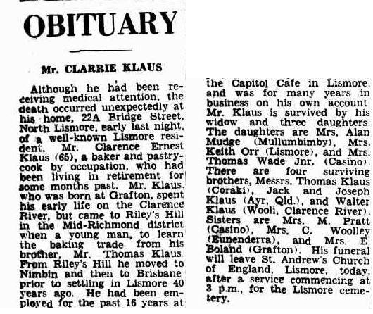 Clarrie retired from the Capitol Café after sixteen years and passed away unexpectedly shortly after, at his home on Bridge Street in North Lismore on the 14th of January, 1952. He was survived by his wife Rosina and their three daughters and sons-in-law. After Clarrie passed away, Rosina went to live with their daughter Myrtle (known as Jo) and her family in Bright Street, Lismore.