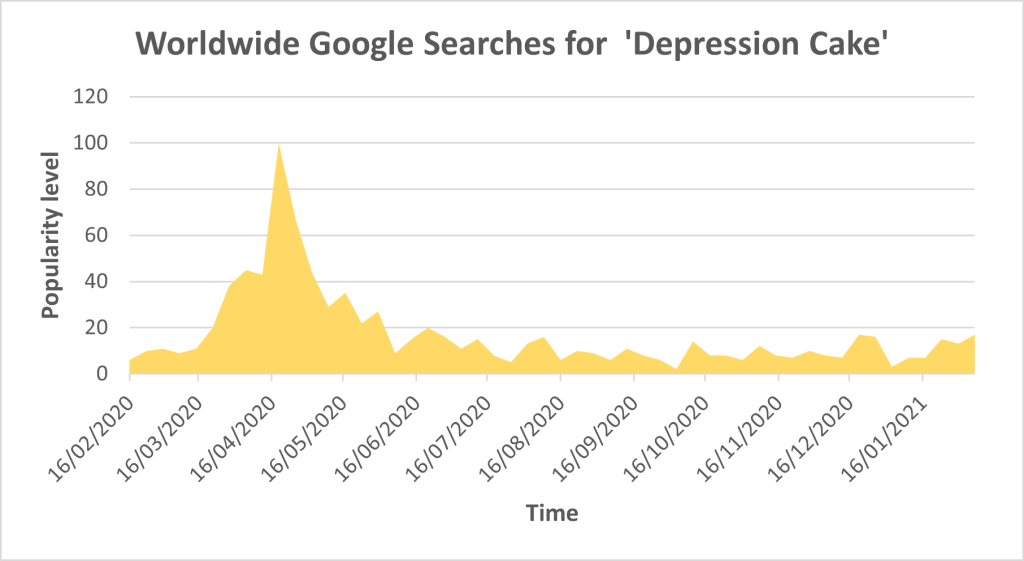 Anecdotally, this may be true for romanticising other people’s past. Just how many people turned to baking during the early months of coronavirus lockdown? Google searches for “Depression Cake” took off during March to May in 2020 when global lockdown and isolation was at its peak.