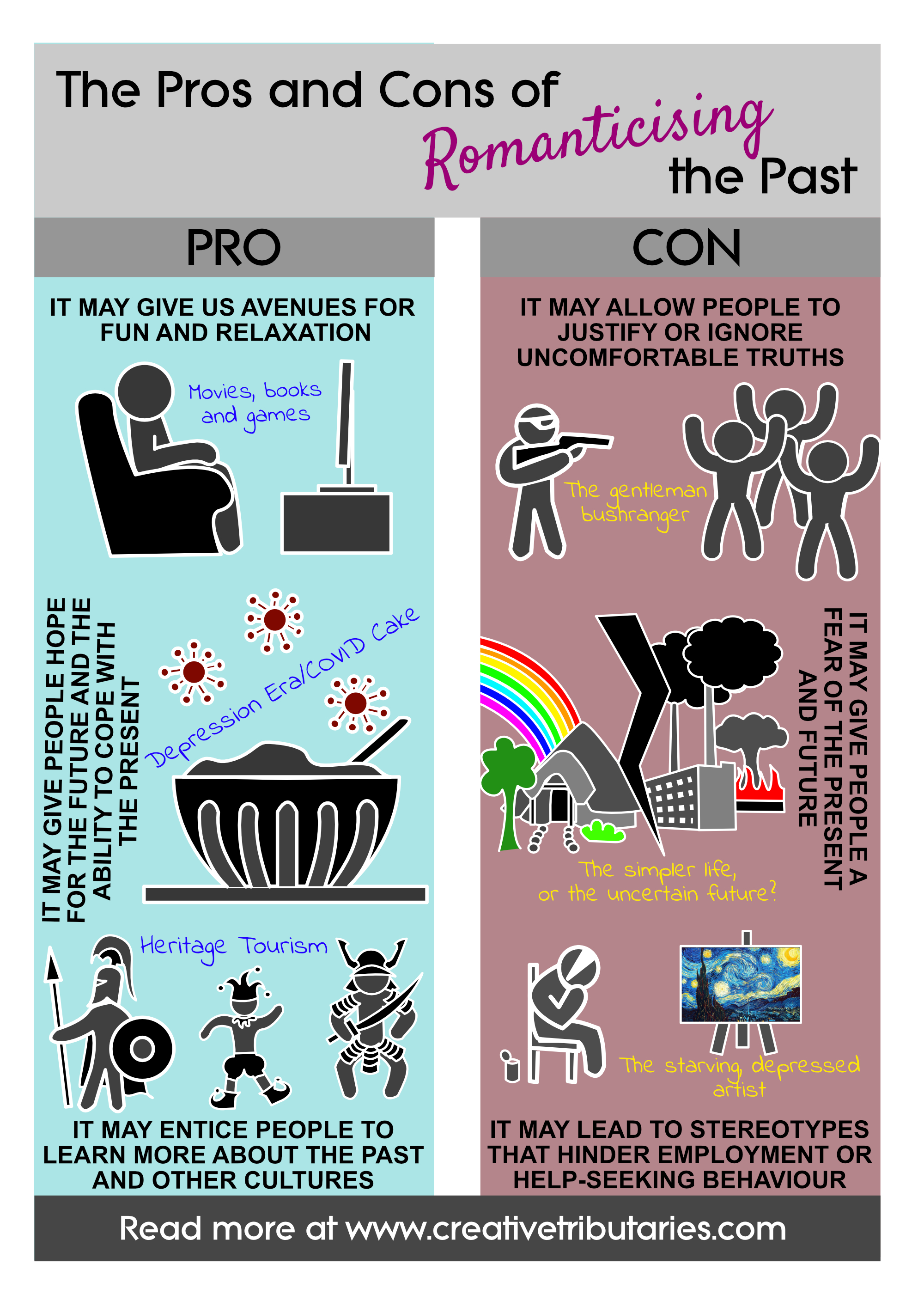 I’d like to suggest this as a pro of romanticising the past even though I’m struggling to find written sources. Ancient Egypt, medieval Europe, the Wild West – all drive people to re-enactments, museums and historical tourist attractions in droves, and with a bit of luck they will learn something on the way.