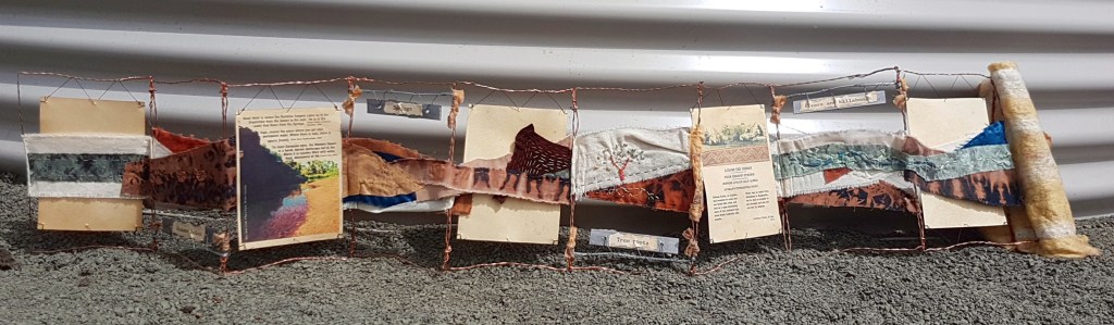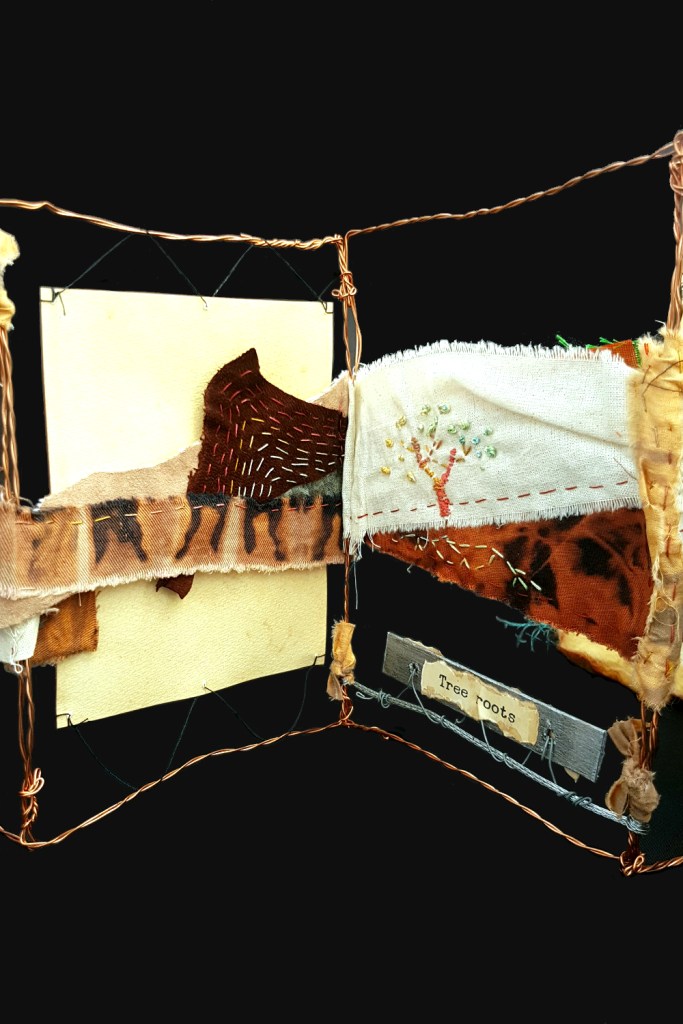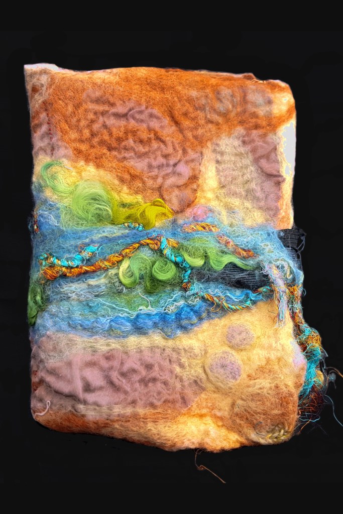 This accordion book consists of a hand-felted cover with copper-wire and embroidered cloth and card pages. Much of the cloth was reduction-dyed cotton done by myself using bleach on otherwise-black fabric.