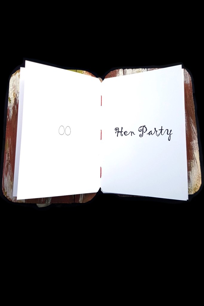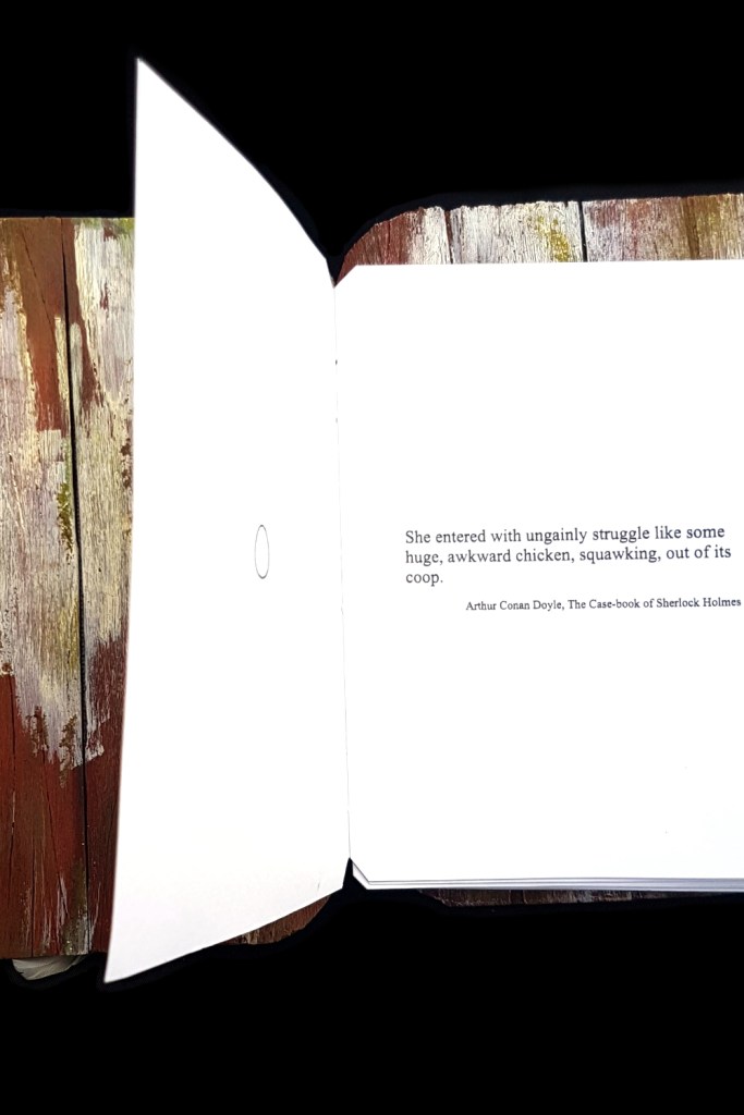 This book consists of chicken feathers and polymer clay covers (the feathers having fallen off naturally from both our and our friends’ pet chickens), and a faux suede spine.