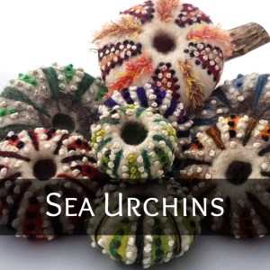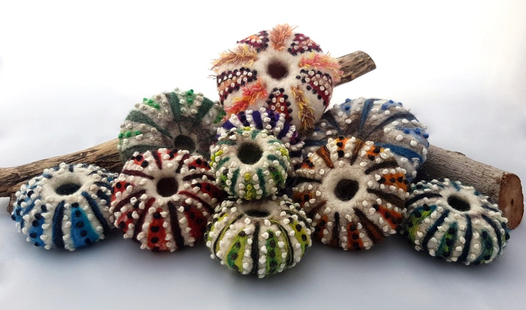 The felt and stitch sea urchin shells are made using a variety of techniques. The bases are wet-felted using white and natural grey wool. Coloured vertical stripes are added using needle-felting techniques and the tubercles formed using French knot embrodery stitches.