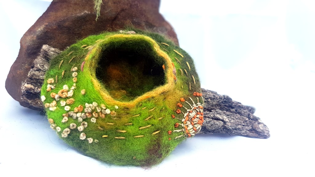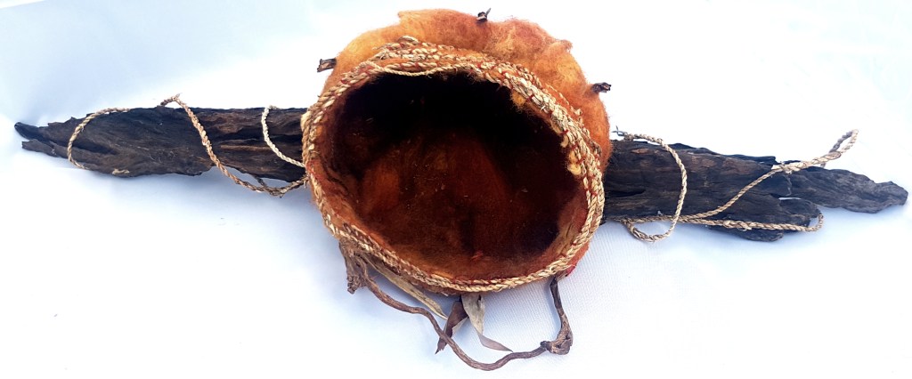 Made during the 2020-2021 Christmas break at my parents’ house, the bird’s nest bowl is made entirely out of supplies from my Mum’s textiles collection or found objects from their garden. The felt bowl is made out of wool naturally hand-dyed by my Mum, and mounted onto a weathered branch. Yucca plants provided the dried leaves that I soaked and spun into cordage, and a potted monstera provided the stems to brace the back of the bowl.