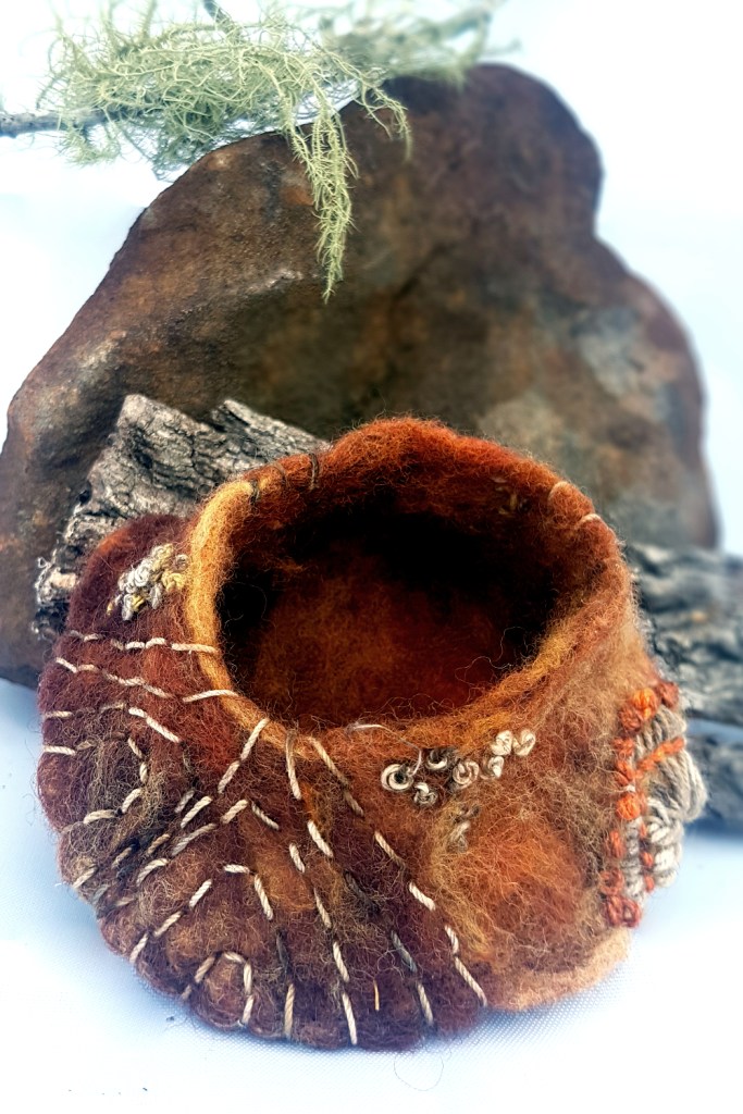 These felt pods were made with vintage, hand-dyed wool and eco- and rust-dyed cotton and silk threads. All of the supplies were made by my Mum and I crafted them into these natural shapes during the 2020-2021 Christmas break.